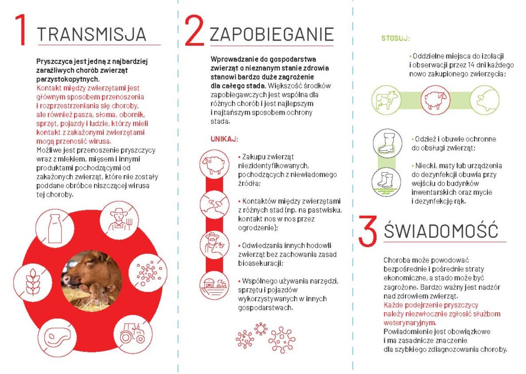 - Kontaktów między zwierzętami z różnych stad (np. na pastwisku, kontakt nos w nos przez ogrodzenie);